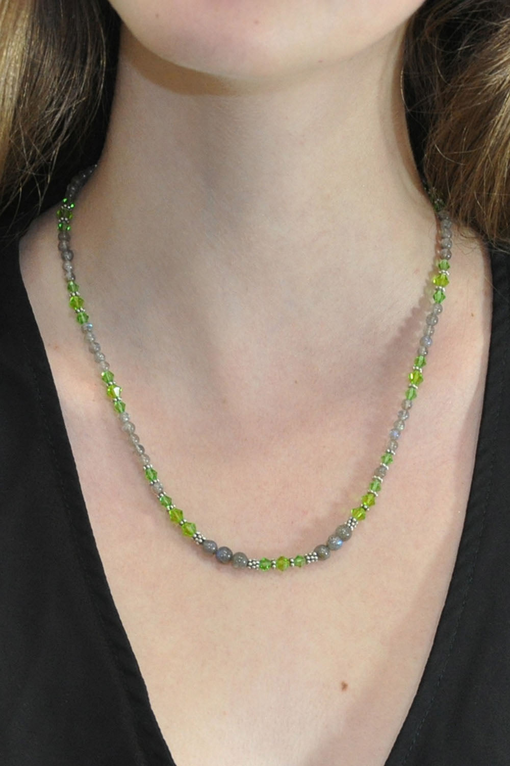 Known for intuition, protection, and transformation, Labradorite gives this necklace its sense of mystery. Crystal accents bring color, meaning, and light, while oxidized sterling silver beads and spacers add depth and texture. A refined piece with a magical presence.